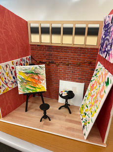 In partnership with the SFPL, Small Matters Miniatures provided the complete kits, including the 3-section gallery wall unit, the floor base, a 2-piece laser cut loft window, a 3D-printed easel, stool, table, art palette, and a miniature "tin" can, laser cut mini paint tubes and paint brushes, an assortment of wall and floor papers, acrylic paints, paint brushes and palettes, Exacto knives, rulers, scissors, glues, and adhesives.